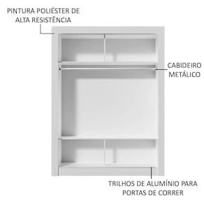 O espaço interno muito bom, com duas prateleiras e quatro nichos, além de um cabideiro de metal resistente e de tamanho diferenciado, 105 cm. Tem espaço para roupas longas, roupas mais curtas, malas, acessórios e muito mais.