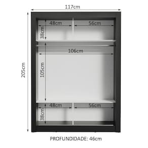 Medidas totais do guarda-roupa: 205 cm de altura x 117 cm de largura x 46 cm de profundidade.