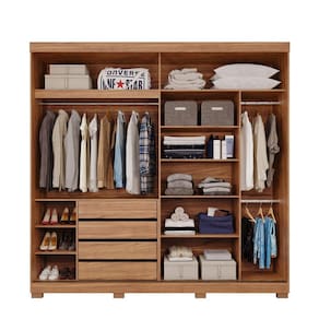 Guarda Roupa Blumenau da Panan com um moderno design nas portas, onde elas possuem detalhes em baixo relevo, trilhos e cabideiros em alumínio o que garantem a qualidade do produto, gavetas com corrediças telescópicas que garantem deslizar suave, divisão interna com duas opções de montagem, possibilitando ao cliente montagem de acordo com sua preferência.