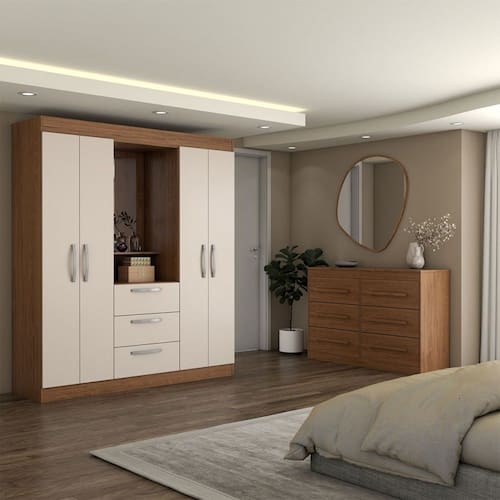 O(a) Guarda-Roupa Solteiro Europa 4 Portas 3 Gavetas e Cômoda 6 Gavetas Cinamomo/Off White - Panorama Moveis é produzido em MDF e MDP na escala de brilho Brilho, e possui um grau de dificuldade de montagem: Médio.