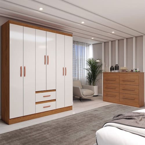 O(a) Guarda-Roupa Solteiro Europa 6 Portas 2 Gavetas com Cômoda 6 Gavetas Cinamomo/Off White - Loja é produzido em MDF e MDP na escala de brilho Semi-Brilho, e possui um grau de dificuldade de montagem: Médio.