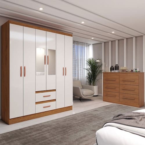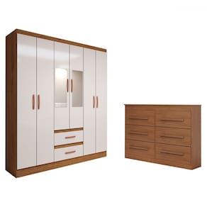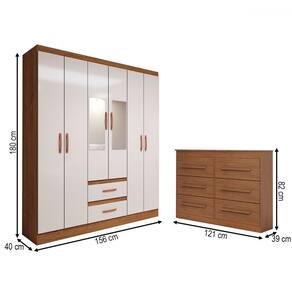 O(a) Guarda-Roupa Solteiro Europa 6 Portas 2 Gavetas com Cômoda 6 Gavetas com Espelho Cinamomo/Off White - Loja é produzido em MDF e MDP na escala de brilho Semi-Brilho, e possui um grau de dificuldade de montagem: Médio.
