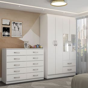 O(a) Guarda-Roupa Solteiro Hazel 4 Portas 2 Gavetas e Espelho com Cômoda 10 Gavetas Branco - Loja é produzido em MDP na escala de brilho Brilhante, e possui um grau de dificuldade de montagem: Médio.