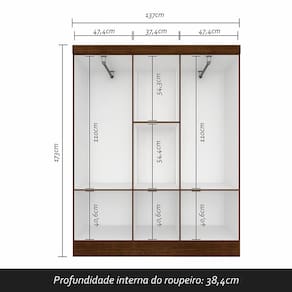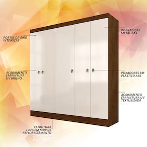 Materiais de Fabricação: -Chapa MDP 12 mm -Cabideiros em madeira -Puxadores em Polietileno -Tonalidade: Freijó/Off Premium -Pintura UV alto-brilho -Peso suportado das prateleiras 5kg