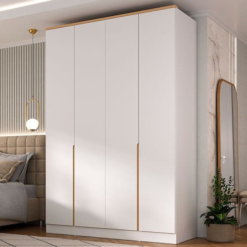 O(a) Guarda-Roupa Solteiro Hong Kong 4 Portas 2 Gavetas Branco/Carvalho - Loja é produzido em MDF na escala de brilho Fosco, e possui um grau de dificuldade de montagem: Médio.