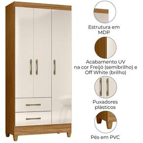Guarda-roupa Solteiro Lima, compacto, funcional e com design moderno. Estrutura em MDP (15/12 mm) e acabamento em pintura UV. Composto por portas com dobradiças metálicas, cabideiro interno (MDP revestido), prateleiras internas e gavetas com corrediças metálicas. Produto com dupla opção de montagem: pés em PVC ou sapatas plásticas (conforme preferência do cliente). Este produto será entregue em 01 volume.