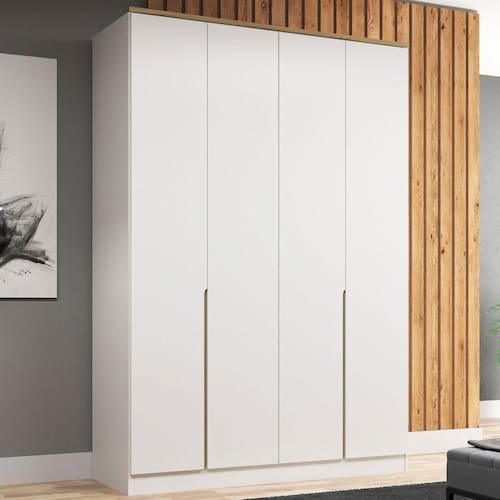 O(a) Guarda Roupa Solteiro Logan 4 Portas 2 Gavetas Branco/Olmo Italiano - Manbel é produzido em MDF na escala de brilho Fosco, e possui um grau de dificuldade de montagem: Médio.