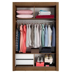 Guarda-Roupa com duas portas de correr de deslizamento suave, trilhos em alumínio, dobradiças metálicas e ferragens de qualidade que proporcionam melhor sustentação ao móvel. Contempla duas gavetas com corrediças metálicas, duas prateleiras e três nichos, além de um cabideiro de metal resistente e de tamanho diferenciado, 105 cm.