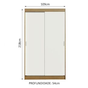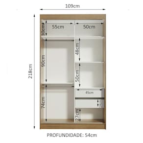 Medidas totais do guarda-roupa: 218 cm de altura x 109 cm de largura x 54 cm de profundidade.
