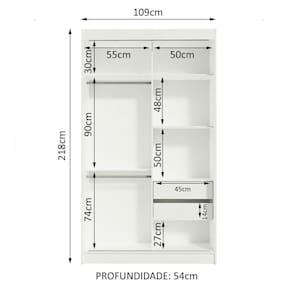 Medidas totais do guarda-roupa: 218 cm de altura x 109 cm de largura x 54 cm de profundidade.