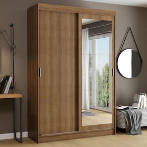 Itens inclusos: - Duas (2) portas de correr em MDP com puxadores em alumínio, sendo uma (1) com espelhos - Duas (2) gavetas com corrediças metálicas - Dois (2) cabideiros de madeira - Cinco (5) nichos