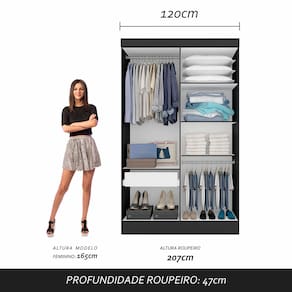 O Guarda Roupa Casal 6 Portas Mariah exibe um design versátil e sofisticado, com detalhes cuidadosamente planejados oferecendo um espaço organizado e elegante para guardar as roupas e acessórios.Detalhes Técnicos- Montado: A: 207cm | L: 120cm | P: 47cm- 6 Divisões internas- 4 Portas de bater- 4 Puxadores- 4 Prateleiras- 2 Cabideiros- 1 Gaveta- Gavetas e Prateleiras suportam até 5kgMateriais- MDP- Dobradiças e Corrediças metálicas- Puxadores em madeira- Cabideiros em alumínio- Revestimento: FF Fosco- Tonalidade: PretoConteúdo da Embalagem- 01 Guarda Roupa- Manual de Montagem- Acessórios para MontagemObservações Importantes- As imagens ambientadas são meramente ilustrativas e podem apresentar itens que não incorporam o produto;- Todos os nossos produtos são novos, acompanham documento fiscal e possuem garantia de 3 meses, essa garantia cobre somente defeitos de fabricação;- A entrega só será efetuada no endereço do CEP, caso o endereço seja diferente do CEP informado no pedido, a entrega terá cobrança adicional e o comprador arcará com as despesas;- Não realizamos entregas para zonas rurais, via caminhos fluviais e distritos, por isso não aceitamos CEP GERAL da região;- Não é possível realizar o agendamento de entrega do produto, é necessário que acompanhe o rastreio de seu pedido para saber a previsão de entrega;- As entregas somente serão realizadas para um responsável maior de idade (+18);- Enviamos para diversos estados, sendo assim nossas entregas são realizadas por transportadoras parceiras de nossa empresa. Confira as dimensões antes da compra e certifique-se de que o produto passará por elevadores, portas e corredores já que nossa entrega não inclui a subida de lances de escada, transporte por elevador e o lançamento de produtos, em caso de condomínios residenciais a entrega é feita somente até a portaria. Todas as entregas são realizadas em dias e horários comerciais;- Ao receber os seus produtos observe se a embalagem se encontra em perfeitas condições. Se você adquiriu algum móvel, confira atentamente a quantidade de volumes e o aspecto físico das embalagens. Confira também se a cor do móvel está de acordo com o seu pedido;- O prazo de cancelamento por arrependimento é de até 7 dias corridos a contar da data de recebimento;- Os produtos e assistências são enviados DESMONTADOS, MONTAGENS E DESMONTAGENS recomendamos sempre a contratação de um montador profissional e é válido lembrar que o custo desses serviços é por conta do comprador;- Objetos decorativos que aparecem na foto não acompanham o produto;- Evitar a exposição direta à luz solar e à umidade;- Para limpeza, limpar com pano macio e seco, não utilizar qualquer outro tipo de produtos químicos;- As cores do produto podem variar de acordo com o monitor, a iluminação do ambiente ou sua percepção visual.