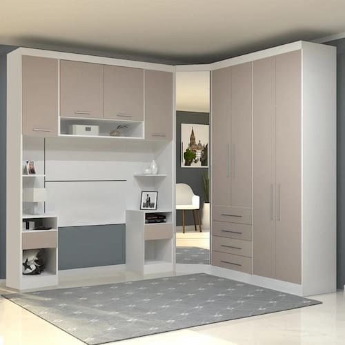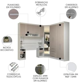 Conteúdo da Embalagem: 1 Guarda Roupa, 1 Canto Oblíquo, 2 Mesas Cabeceira Alta, 1 Armário Aéreo, 2 Painéis Cabeceira.