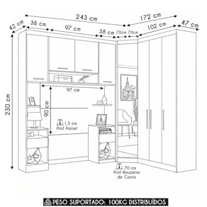 Peso Suportado Distribuído: Guarda Roupa 30Kg/Canto Oblíquo 25Kg/Mesa Cabeceira 15Kg cada/Armário Aéreo 15Kg.