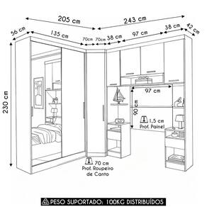 Peso Suportado Distribuído: Guarda Roupa 30Kg/Canto Oblíquo 25Kg/Mesa Cabeceira 15Kg cada/Armário Aéreo 15Kg.