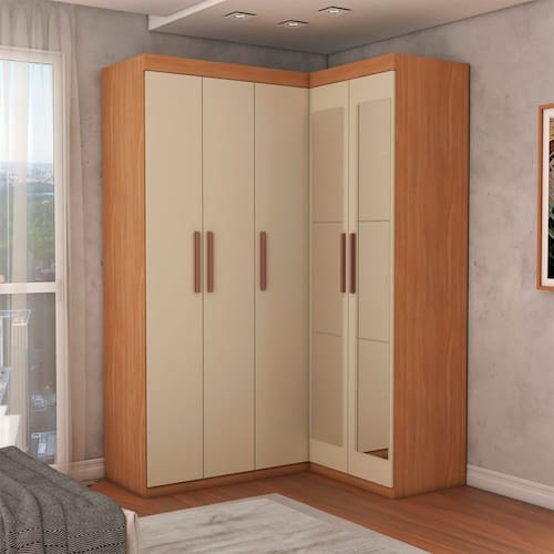 O(a) Guarda-Roupa Solteiro Modulado Odisseia 5 Portas 12 Prateleiras com Espelho Cinamomo/Off White - Loja é produzido em MDP na escala de brilho Brilhante, e possui um grau de dificuldade de montagem: Médio.
