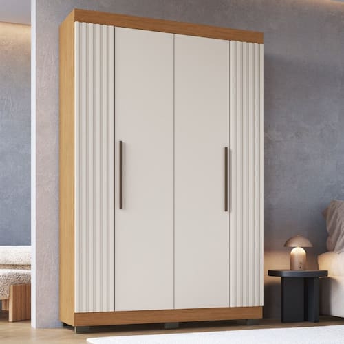 O Guarda Roupa Solteiro Ripado 4 Portas com Pes Florida Faimec e uma opcao funcional e elegante para organizar seu espaco. Com 4 portas e 2 gavetas, oferece amplo espaco interno, alem de um cabideiro em aluminio para melhor disposicao das roupas. Sua estrutura em MDP garante resistencia e durabilidade, enquanto o acabamento acetinado texturizado agrega sofisticacao. Conta ainda com corredicas telescopicas para maior suavidade na abertura das gavetas e puxadores em ABS, proporcionando um design moderno. Os pes elevados com um toque estiloso ao ambiente.