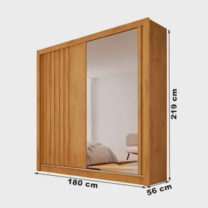 Particularidades do guarda-roupa: Características: - Ripado em MDF; - 100% MDF, chapas de 15mm; - Roldana com regulagem; - Espelho lateral; - Gavetas com corrediças telescópicas; - Cabideiros em alumínio; - Modulado para roupas longas; - Dobradiças modernas e reforçadas;