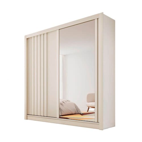 Particularidades do guarda-roupa: Características: - Ripado em MDF; - 100% MDF, chapas de 15mm; - Roldana com regulagem; - Espelho lateral; - Gavetas com corrediças telescópicas; - Cabideiros em alumínio; - Modulado para roupas longas; - Dobradiças modernas e reforçadas;