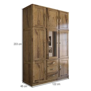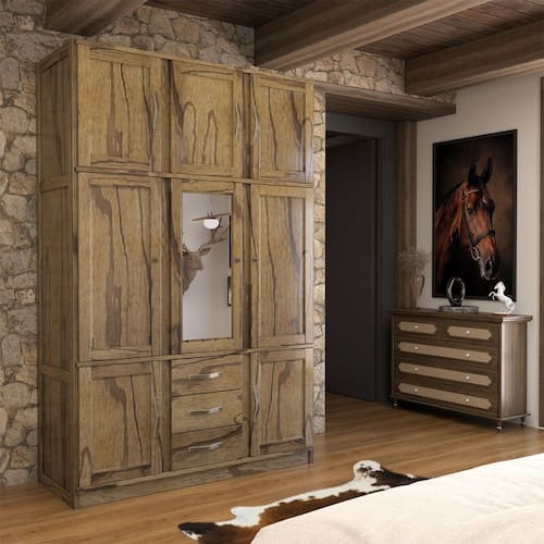 Guarda-Roupa Solteiro Rústico 8 Portas 3 Gavetas Madeira Maciça com Espelho Castanho - Panorama Móveis - Marrom