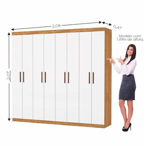 Guarda-Roupa Stanley é um produto perfeito para quem procura qualidade e durabilidade no mesmo móveis. Possui 2,07m de altura, 2,08m de largura e 0,47m de profundidade combinado com 8 portas, 4 gavetas, 4 prateleiras e dois grandes cabideiros, deixando o produto com uma ótima divisão interna. Acabamento da Prateleira: Pintura UV Escala de Brilho da Prateleira: Fosco Possui Cabideiros: Sim Acabamento da Gaveta: Pintura UV Escala de Brilho da Gaveta: Fosco Possui Organizador de Gaveta: Não Acabamento da Porta: Pintura UV Escala de Brilho da Porta: Semi-Brilho Material do Puxador da Porta: MDF Ambiente Principal: Quarto codigo_ean: 7900288107091 Complexidade da Montagem: Média: pode ser montado por mais de uma pessoa e/ou necessite de maior conhecimento para montagem Cor: Cinamomo/Branco Cor do Produto: Cinamomo/Branco Cor do Puxador: Marrom Cor Interna: Branco Escala de Brilho: Semi-Brilho Espessura da Estrutura (mm): 12 mm Espessura das Portas (mm): 19 mm Espessura das Prateleiras (mm): 12 mm Espessura do Fundo (mm): 2,5 mm Espessura do Fundo das Gavetas (mm): 2,5 mm Gaveta com Chave: Não Itens Inclusos: 01 Guarda-Roupas e Qr Coode de Montagem Linha ou Coleção: Stanley Manual de Montagem e Instalação: https://product-hub-prd.madeiramadeira.com.br/983631/documents/47831602-1c35-42c7-b6e7-78a78b766ff6277865940417435904440789.pdf Marca: Carioca Móveis Material da Gaveta: MDP Material da Porta: MDP Material da Prateleira: MDP Material Principal: MDP modular: Não Montagem Flex: Não Necessita Montagem: Sim Nicho com Cabideiro: Não Origem do Produto: Nacional Peso: 114,8 kg Peso Máximo por Gaveta: 5 kg Peso Máximo por Prateleira: 5 kg Porta Janelada: Não Possui Espelho: Não Possui Pés: Não Possui Portas: Sim Possui Prateleiras: Sim Possui Sapateira: Não Produto Montado: Sim Quantidade de Cabideiros: 02 Cabideiros Quantidade de Gavetas: 04 Gavetas Quantidade de Prateleiras: 04 Prateleiras Recomendações de Uso, Manutenção e Limpeza: Limpar com flanela ou pano macio seco. Não utilizar produtos abrasivos, desengordurantes, álcool ou solvente. Não expor o produto diretamente à luz solar e à umidade. Sistema de Montagem: Parafusos e Cavilhas. Tipo de Corrediça da Gaveta: Metálica Simples Tipo de Dobradiça/Corrediça da Porta: Aço Tipo de Gaveta: Interna Tipo de Guarda-Roupa: Casal Tipo de Puxador da Gaveta: Não Possui Tipo de Puxador da Porta: Externo