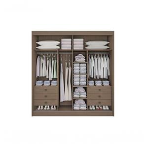 Particularidades do guarda-roupa: Características: - MDF - Gavetas com corrediças telescópicas - Profundidade da gaveta: 40 cm - Abertura total da gaveta - Suporte cabide metálico - Puxadores de alumínio - Produzido com chapa de 15mm e 25mm - Gavetas com puxador - Interno com 2 opções de montagem - Roldanas com molas - Espelho com película de