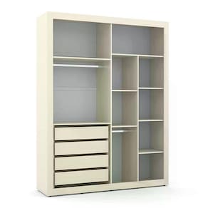 ESPECIFICAÇÕES: Estrutura 100% MDF Pintura UV 4 Portas com puxadores usinados 4 Gavetas internas Corrediças telescópicas Cabideiros em alumínio Dobradiças metálicas Portas com detalhes em baixo relevo Amplo espaço interno