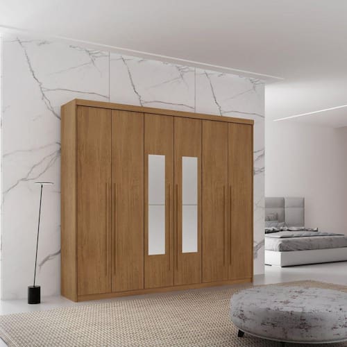 Roupeiro Grécia, produzido em material 100% MDF, possui visual robusto e tradicional, com puxadores em madeira que conferem maior estabilidade ao abrir e fechar as portas. As dobradiças são metálicas que garante maior suavidez , tornando as portas mais firmes e fáceis de abrir. Conta com 2 gavetas para roupas mais leves, e compartimentos com prateleiras, cabideiros, para as roupas mais pesadas que suportam até 7 kg. Suas 2 gavetas possuem corrediças telescópicas, proporcionando uma abertura fácil, macia e que desliza suavemente. Conta com 3 cabideiros alumínio, sendo mais resistentes que os de plástico e com 4 espelhos retangulares para um maior ar de sofisticação. Em sua confecção é utilizada a pintura UV texturizada e acabamento semi-fosco, que preserva a sua cor por mais tempo. Acabamento da Prateleira: Pintura Texturizada UV Escala de Brilho da Prateleira: Semi-Brilho Possui Cabideiros: 02 Acabamento da Gaveta: Pintura Texturizada UV Escala de Brilho da Gaveta: Semi-Brilho Possui Organizador de Gaveta: Não Acabamento da Porta: Pintura Texturizada UV Escala de Brilho da Porta: Semi-Brilho Material do Puxador da Porta: Madeira Maciça Acabamento dos Pés: Pintura Altura do Espelho: 800 cm Altura dos Pés: 100 cm Ambiente Principal: Quarto codigo_ean: 7909903637036 Complexidade da Montagem: Média: pode ser montado por mais de uma pessoa e/ou necessite de maior conhecimento para montagem Cor: Naturalle Cor do Produto: Naturalle Cor Flex: Não Cor Interna: Naturalle Escala de Brilho: Semi-Brilho Espessura do Espelho: 3 mm Formato do Espelho: Retangular Gaveta com Chave: Não Guarda-Roupa Suporta Até (kg): 70 kg Itens Inclusos: 1 Guarda-Roupa e 1 manual de montagem Largura do Espelho: 200 cm Linha ou Coleção: Espanha 6 portas Manual de Montagem e Instalação: https://product-hub-prd.madeiramadeira.com.br/900334/documents/3e052542-06c9-458c-851b-29453f22492368810manualveracruz6portas.pdf Material da Gaveta: MDF Material da Porta: MDF Material da Prateleira: MDF Material dos Pés: MDF Material Principal: MDF modular: Não Montagem Flex: Sim. Suas prateleiras e cabideiros podem ser montados de duas maneiras diferentes Necessita Montagem: Sim Origem do Produto: Nacional Peso: 98,82 kg Peso Máximo por Gaveta: 5 kg Peso Máximo por Prateleira: 7 kg Possui Calceiros: 01 Possui Espaço para Vestidos Longos: Sim Possui Espelho: Sim Possui Espelho Interno: Não Possui Ganchos: Não Possui iluminação: Não Possui Painel de TV: Não Possui Pés: Rodapé Possui Portas: Sim Possui Prateleiras: Sim Possui Sapateira: Sim Produto Montado: Sim Quantidade de Espelho: 04 Espelhos com Tamanhos Iguais Quantidade de Gavetas: 02 Gavetas Quantidade de Prateleiras: 05 Prateleiras Recomendações de Uso, Manutenção e Limpeza: Limpar com pano seco Sapatas Niveladoras: Não Sistema de Montagem: parafusos e cavilhas Suporta Até (kg): 70 kg Tipo de Corrediça da Gaveta: Metálica Telescópica Tipo de Dobradiça/Corrediça da Porta: Metálica Tipo de Fixação do Espelho: Parafusos Tipo de Gaveta: Interna Tipo de Guarda-Roupa: Casal Tipo de Puxador da Gaveta: Não Possui Tipo de Puxador da Porta: Externo
