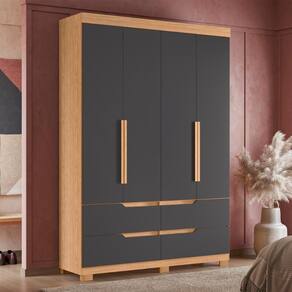 Feito em MDP.Possui detalhes nas portas laterais com acabamento ripado, 4 gavetas com corrediça telescópicas, 4 portas, 2 cabideiros e 10 prateleiras