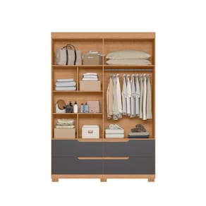 Feito em MDP.Possui detalhes nas portas laterais com acabamento ripado, 4 gavetas com corrediça telescópicas, 4 portas, 2 cabideiros e 10 prateleiras