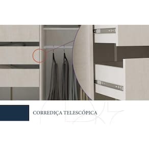 Material do Calceiro - Calceiro Metálico Material dos Cabideiros - Cabideira Metálico Tipo de Porta do Guarda-Roupa - Portas de Correr Material das Portas - Portas em MDP Quantidade de Portas - 2 Portas de Correr Material das Gavetas - Gavetas em MDP Tipo de Corrediça - c/ Corrediças Telescópicas Quantidade de Gavetas - 6 Gavetas Tipo dos Pés - Pés Opcionais Material das Prateleiras - Prateleiras em MDP Quantidade de Prateleiras - 7