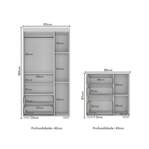Dimensões do produto montado: Guarda-Roupas - Altura: 189cm | Largura: 90cm | Profundidade: 42cm Cômoda - Altura: 87cm | Largura: 88cm | Profundidade: 43cm *Você pode consultar as medidas detalhadas na imagem técnica do produto.