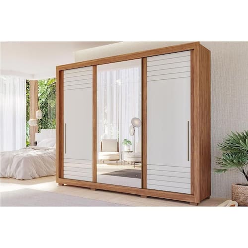 Guarda Roupa Casal 3 Portas de Correr (1 c/ Espelho) e 6 Gavetas c/ Pés Vitória Cinamomo/Off White - Panan