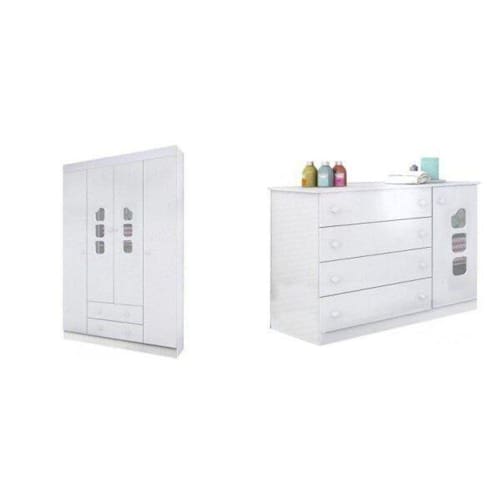 Guarda Roupas 4 Portas 2 Gavetas e Cômoda 4 Gavetas 1 Porta Lívia Phoenix Baby Branco. Com esse conjunto de guarda roupas 4 portas 2 gavetas Lívia e cômoda 4 gavetas 1 porta Lívia, você vai ambientar seu sonho com qualidade, estilo e segurança, produzido todo em MDF com acabamento branco brilho, Corrediças e dobradiças metálicas, amplo espaço e muito com muito bom gosto. Ean: 7908439689274