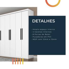 Um quarto moderno e aconchegante precisará de um móvel diferenciado como este Guarda Roupa Mayara da Araplac, desenvolvido para oferecer total conforto e comodidade para você e sua família. Ele é composto por 8 portas de bater, puxadores de PVC em preto, 4 gavetas internas, corrediças e bastões metálicos. Seu material é ecologicamente correto que confere boa resistência e durabilidade ao móvel. Surpreenda-se com design, inovação, beleza e durabilidade! MODELO:Guarda Roupas Casal Mayara Araplac MARCA: Araplac COR: Branco MEDIDAS: A: 218 cm L: 240 cm P: 47 cm MATERIAL: MDP com 12mm e 15mm de Espessura ACABAMENTO: Impressão UV (Ultravioleta) PORTAS: Sim, possui 8 portas GAVETAS: Sim, possui 4 gavetas PRATELEIRAS: Sim, possui 10 prateleiras DOBRADIÇAS: Metálicas PUXADORES: PVC CABIDEIROS: Metálico QUANTIDADE DE CABIDEIRO: 4 CORREDIÇA: Metálica PÉS: Não SISTEMA DE MONTAGEM: Parafusos, minifix, portas ESPELHO: Não PRATELEIRAS SUPORTAM ATÉ: 3kg GAVETAS SUPORTAM ATÉ: 3kg PESO: 156,10kg DIFERENCIAL: Produzido em MDP de alta qualidade; Acabamento de pintura em UV 8 portas com dobradiças metálicas; Montagem não inclusa. Entregamos até a porta de entrada da casa do cliente ou até a portaria do condomínio. MODELO: Guarda Roupas Casal Mayara Araplac | MARCA: Araplac | COR: Branco | MEDIDAS: A: 218 cm L: 240 cm P: 47 cm | MATERIAL: MDP com 12mm e 15mm de Espessura | ACABAMENTO: Impressão UV (Ultravioleta) | PORTAS: Sim, possui 8 portas | GAVETAS: Sim, possui 4 gavetas | PRATELEIRAS: Sim, possui 10 prateleiras | DOBRADIÇAS: Metálicas | PUXADORES: PVC | CABIDEIROS: Metálico | QUANTIDADE DE CABIDEIRO: 4 | CORREDIÇA: Metálica | PÉS: Não | SISTEMA DE MONTAGEM: Parafusos, minifix, portas | ESPELHO: Não | PRATELEIRAS SUPORTAM ATÉ: 3kg | GAVETAS SUPORTAM ATÉ: 3kg | PESO: 156,10kg | OBS: Montagem não inclusa. Entregamos até a porta de entrada da casa do cliente ou até a portaria do condomínio. Cor: Branco