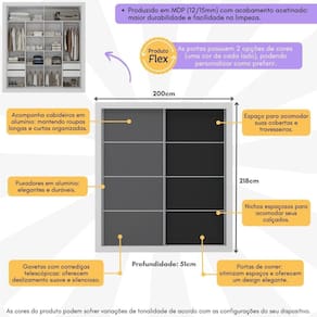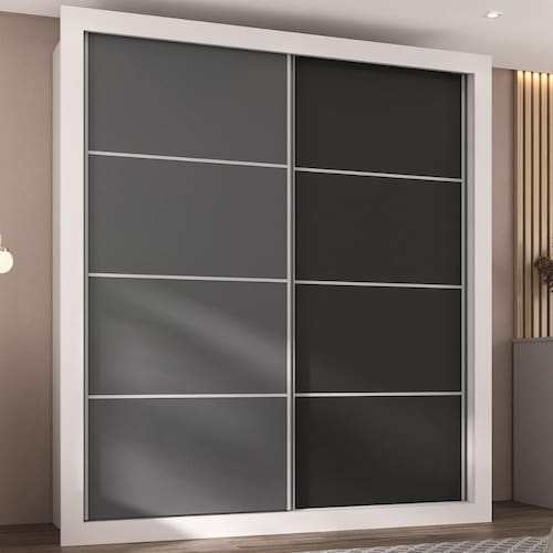 Produzido em MDP (12/15mm) com acabamento acetinado (cerca de 20% de brilho), este guarda-roupas garante resistência e um toque moderno ao ambiente. As 2 portas de correr possuem 2 opções de cores (cada lado de uma cor), permitindo personalizar o móvel entre 3 combinações no momento da montagem, adaptando-o à decoração do seu quarto.