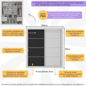 Produzido em MDP (12/15mm) com acabamento acetinado (cerca de 20% de brilho), o guarda-roupas garante resistência e um toque sofisticado. As 2 portas de correr com cores distintas possuem cada lado de 1 cor, permitindo personalizar o móvel entre 4 combinações no momento da montagem, adaptando-o à decoração do seu quarto.