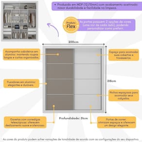 Design e durabilidade: Produzido em MDP (12/15mm) com acabamento acetinado (cerca de 20% de brilho), este guarda-roupas garante resistência e um toque moderno ao ambiente. As 2 portas de correr possuem 2 opções de cores (cada lado de uma cor), permitindo personalizar o móvel entre 3 combinações no momento da montagem, adaptando-o à decoração do seu quarto.