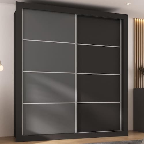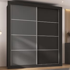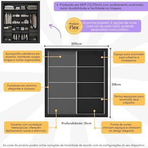 Design e durabilidade: Produzido em MDP (12/15mm) com acabamento acetinado (cerca de 20% de brilho), este guarda-roupas garante resistência e um toque moderno ao ambiente. As 2 portas de correr possuem 2 opções de cores (cada lado de uma cor), permitindo personalizar o móvel entre 3 combinações no momento da montagem, adaptando-o à decoração do seu quarto.