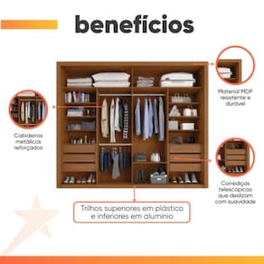 O Guarda Roupa Imperador foi desenvolvido para aliar praticidade e elegância, proporcionando um espaço amplo e bem distribuído para organizar suas roupas, edredons, travesseiros e calçados com eficiência. Seu design moderno e sofisticado conta com duas portas de correr, agregando funcionalidade e sofisticação ao ambiente. Com seis gavetas espaçosas, as duas primeiras de cada lado possuem divisórias inteligentes, para armazenar pequenos itens com mais organização. Além disso, suas corrediças telescópicas garantem uma abertura suave e completa, proporcionando mais conforto no uso diário! O Guarda Roupa Imperador é a escolha perfeita para quem busca beleza, qualidade e durabilidade em um único móvel.