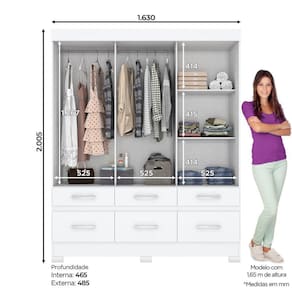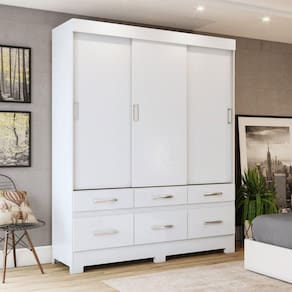 Se você busca organização e praticidade para o seu espaço, o guarda-roupas de 3 portas de correr da linha B93 é a opção perfeita. Com um design moderno e elegante, ele se destaca pela sua funcionalidade e capacidade de armazenamento. Com seis gavetas espaçosas, você terá lugar de sobra para guardar suas roupas, acessórios e objetos pessoais de forma organizada e ao alcance das mãos. Além disso, as portas de correr facilitam o acesso ao interior do guarda-roupas, sem ocupar espaço no ambiente. Fabricado com materiais de alta qualidade, esse guarda-roupas oferece durabilidade e resistência, garantindo que seus pertences estarão protegidos por muito tempo. Além disso, sua cor neutra e acabamento sofisticado combinam com qualquer estilo de decoração, deixando o ambiente ainda mais harmonioso. Acabamento da Prateleira: Pintura Texturizada UV Escala de Brilho da Prateleira: Fosco Possui Cabideiros: 01 Acabamento da Gaveta: Pintura UV Escala de Brilho da Gaveta: Brilhante Material do Puxador da Gaveta: ABS Possui Organizador de Gaveta: Não Acabamento da Porta: Pintura UV Escala de Brilho da Porta: Brilhante Material do Puxador da Porta: ABS Altura dos Pés: 5 Altura Máxima dos Pés: 5.0000 Ambiente Principal: Quarto codigo_ean: 7909903338148 Complexidade da Montagem: Média: pode ser montado por mais de uma pessoa e/ou necessite de maior conhecimento para montagem Cor: Branco Cor do Produto: Branco Cor Flex: Não Cor Interna: Trama Branco Escala de Brilho: Brilhante Gaveta com Chave: Não Guarda-Roupa Suporta Até (kg): 50 kg Informações Complementares: • Cabideiro resistente de madeira revestido; • 6 Gavetas com corrediças metálicas; • Puxadores em ABS; • Frentes de MDP 15mm. Itens Inclusos: 1 Guarda Roupa, Kit Ferragens e Manual de Montagem Linha ou Coleção: BE21 Manual de Montagem e Instalação: https://product-hub-prd.madeiramadeira.com.br/855483/documents/f04fe549-f218-45bf-a823-0a6f39b09259oupeiro3ptsdeslizantes6gav.pdf Material da Gaveta: MDP Material da Porta: MDP Material da Prateleira: MDP Material dos Pés: ABS Material Principal: MDP Necessita Montagem: Sim Origem do Produto: Nacional Peso: 87 kg Peso Máximo por Gaveta: 3 kg Peso Máximo por Prateleira: 8 kg Possui Calceiros: Não Possui Espelho: Não Possui Pés: 08 Produto Montado: Sim Recomendações de Uso, Manutenção e Limpeza: Para limpeza de seu móvel, use uma flanela seca ou umedecida. Não utilize produtos químicos que possam danificar o produto. Sapatas Niveladoras: Não Sistema de Montagem: Parafusos e Cavilhas Tipo de Corrediça da Gaveta: Metálica Simples Tipo de Dobradiça/Corrediça da Porta: Metálica Tipo de Gaveta: Externa Tipo de Guarda-Roupa: Casal Tipo de Puxador da Gaveta: Externo Tipo de Puxador da Porta: Externo