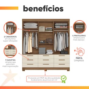 O guarda roupas Uraí tem um design moderno e funcional, com 3 portas de correr e puxadores em MDF revestido, proporcionam praticidade e um visual sofisticado. Seus pés em PVC garantem estabilidade e proteção contra o contato direto com o chão. Conta com 9 gavetas externas equipadas com corrediças telescópicas para um bom deslizamento, 2 cabideiros para melhor organização de seu espaço, espaço para calçados, e amplas prateleiras para organização de acessórios e outros itens. Além disso, um amplo maleiro para armazenar objetos maiores. O sistema de portas de correr utiliza trilho metálico, garantindo maior durabilidade e eficiência no uso diário. Este guarda roupas combina praticidade, espaço e um design elegante, ideal para quem busca otimizar o ambiente e o uso no dia a dia.