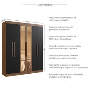 Com 6 portas (sendo as 2 centrais em vidro reflecta) e um amplo espaço interno, tudo fica mais fácil de armazenar. As 2 gavetas internas com corrediças telescópicas garantem sua abertura total e silenciosa, enquanto os nichos espaçosos acomodam roupas dobradas, calçados e cobertores com praticidade. Já os cabideiros metálicos foram pensados para otimizar o espaço, permitindo pendurar roupas longas ou curtas sem amassar.