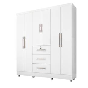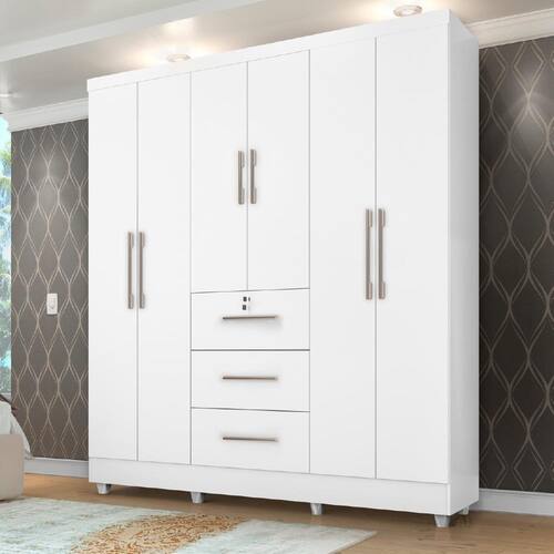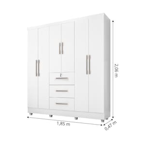 O Roupeiro Tókio 6 portas, possui 4 prateleiras internas,3 cabideiros e 3 gavetas externas, sendo uma com chave. O modelo transmite conforto e beleza ao ambiênte. Possui pintura UV, com verniz brilhante, que alta resistência e durabilidade ao produto./ NOME: Guarda Roupas CasalTókio/ MARCA: J&A/ COR: Branco/ MEDIDAS:A: 206cmL: 185cmP: 47cm/ MATERIAL: MDP12mm/ PORTAS: Sim, 6/ GAVETAS: Sim, 3/ PRATELEIRAS: Sim, 4 prateleiras internas/ CORREDIÇAS: Metálicas/ DOBRADIÇAS: Metálicas/ PUXADORES: Em PVC/ CABIDEIROS: Sim, 3/ PÉS: Em PVC/ DIFERENCIAL: Excelente distribuição interna/ PESO: 89,11kg/ SUPORTA ATÉ: 70kg/ GAVETAS SUPORTAM: 10kg/ PRATELEIRAS SUPORTAM: 15kg/ Montagem não inclusa. Entregamos até a porta de entrada da casa do cliente ou até a portaria do condomínio.