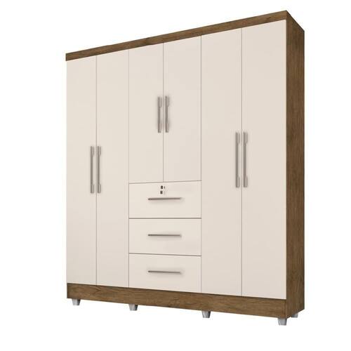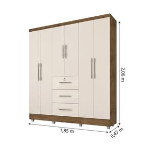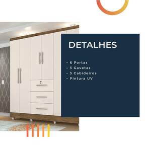 Guarda Roupas Casal 6 Portas 3 Gavetas Tokio Jequitibá / Off White Jequajequitibá/off Whiteitibá/off White O Roupeiro Tókio 6 portas, possui 4 prateleiras internas, 3 cabideiros e 3 gavetas externas, sendo uma com chave. O modelo transimite conforto e beleza ao ambiênte. Possui pintura UV, com verniz brilhante, que alta resistência e durabilidade ao produto. NOME: Guarda Roupas Casal Tókio MARCA: J&A COR: Jequitibá / Off White MEDIDAS: A: 206 cm L: 185 cm P: 47 cm MATERIAL: MDP 12mm PORTAS: Sim, 6 GAVETAS: Sim, 3 PRATELEIRAS: Sim, 4 prateleiras internas CORREDIÇAS: Metálicas DOBRADIÇAS: Metálicas PUXADORES: Em PVC CABIDEIROS: Sim, 3 PÉS: Em PVC DIFERENCIAL: Excelente distribuição interna PESO: 89,11kg SUPORTA ATÉ: 70kg GAVETAS SUPORTAM: 10kg PRATELEIRAS SUPORTAM: 15kg
