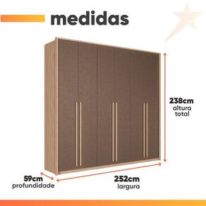 Importante sobre a entrega: A entrega é realizada até a portaria ou porta de entrada do endereço indicado, desde que o acesso seja permitido. Para locais com portaria, a entrega será feita no piso térreo. Não realizamos montagem, desmontagem, transporte por escadas ou içamento. É responsabilidade do cliente verificar se as dimensões do produto são compatíveis com portas, elevadores e corredores. Evite imprevistos: confira todos os detalhes antes de concluir sua compra. MEDIDAS:: [ A ] = 238 cm [ L ] = 252 cm [ P ] = 59 cm | PESO:: 206,25 kg | PESO SUPORTADO:: 115 kg | GAVETAS SUPORTAM ATÉ:: 3 Kg | PRATELEIRAS SUPORTAM ATÉ:: 8 Kg | CABIDEIRO SUPORTA ATÉ:: 5 Kg | MODELO:: Guarda Roupas Casal 6 Portas 4 Gavetas Milano | MARCA:: Santos Andirá | PINTURA DO GUARDA ROUPAS:: Wood com acabamento em verniz fosco | ACABAMENTO DAS PORTAS:: Texturizado com efeito que imita couro | MATERIAL:: MDP (12/15/25mm) | PORTAS:: 6 | TIPO DE PORTA:: Bater (Dobradiças Snow Motion) | GAVETAS:: 4 | PRATELEIRAS:: 7 | QUANTIDADE DE CABIDEIRO:: 3 | CABIDEIROS:: Alumínio | CORREDIÇAS:: Telescópicas Metálicas | PUXADOR:: MDF | DIFERENCIAL:: Portas com acabamento texturizado imitando o couro, puxadores em MDF revestido, gavetas internas com corrediças telescópicas, cabideiros oblongos de alumínio, dobradiças com amortecedores. | SISTEMA DE MONTAGEM:: Parafusos, Cavilha, Minifix. | INSTRUÇÕES E CUIDADOS:: Utilizar panos secos ou levemente úmidos, não utilizar produtos químicos. | GARANTIA:: 3 meses pelo fabricante. | AVISO:: Importante sobre a entrega: A entrega é realizada até a portaria ou porta de entrada do endereço indicado, desde que o acesso seja permitido. Para locais com portaria, a entrega será feita no piso térreo. | Altura: 238 | Inclui manual de montagem: Sim | Largura: 252 | Materiais da estrutura: MDP | Profundidade: 59 | Requer montagem: Sim | Cor: Madeirado/Terracota