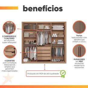 DIFERENCIAL: Portas com acabamento texturizado imitando o couro, puxadores em MDF revestido, gavetas internas com corrediças telescópicas, cabideiros oblongos de alumínio, dobradiças com amortecedores.