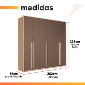 MEDIDAS: [ A ] = 238 cm [ L ] = 252 cm [ P ] = 59 cm PESO: 206,25 kg PESO SUPORTADO: 115 kg GAVETAS SUPORTAM ATÉ: 3 Kg PRATELEIRAS SUPORTAM ATÉ: 8 Kg CABIDEIRO SUPORTA ATÉ: 5 Kg MODELO: Guarda Roupas Casal 6 Portas 4 Gavetas Milano MARCA: Santos Andirá PINTURA DO GUARDA ROUPAS: Wood com acabamento em verniz fosco ACABAMENTO DAS PORTAS: Texturizado com efeito que imita couro MATERIAL: MDP (12/15/25mm) PORTAS: 6 TIPO DE PORTA: Bater (Dobradiças Snow Motion) GAVETAS: 4 PRATELEIRAS: 7 QUANTIDADE DE CABIDEIRO: 3 CABIDEIROS: Alumínio CORREDIÇAS: Telescópicas Metálicas PUXADOR: MDF DIFERENCIAL: Portas com acabamento texturizado imitando o couro, puxadores em MDF revestido, gavetas internas com corrediças telescópicas, cabideiros oblongos de alumínio, dobradiças com amortecedores. SISTEMA DE MONTAGEM: Parafusos, Cavilha, Minifix. INSTRUÇÕES E CUIDADOS: Utilizar panos secos ou levemente úmidos, não utilizar produtos químicos. GARANTIA: 3 meses pelo fabricante.