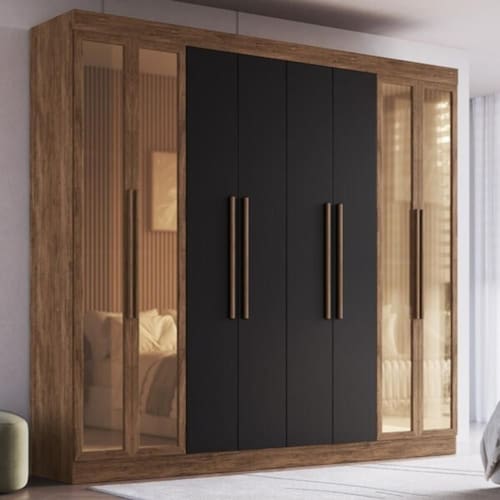 Organização e ambiente elegante: Com 8 portas (sendo as 4 laterais em vidro reflecta) e um amplo espaço interno, tudo fica mais fácil de armazenar. As 4 gavetas internas com corrediças telescópicas garantem sua abertura total e silenciosa, enquanto os nichos espaçosos acomodam roupas dobradas, calçados, travesseiros e cobertores com praticidade. Já o cabideiro metálico foi pensado para otimizar o espaço, permitindo pendurar roupas longas e curtas sem amassar.