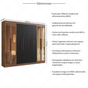 Especificações Técnicas: Altura: 217cm | Largura: 242cm | Profundidade: 47cm Material: 100% MDF Acabamento: Pintura UV Quantidade de Portas: 8 Quantidade de Gavetas: 4 Tipo de Corrediça: Telescópica Material do Cabideiro: Alumínio